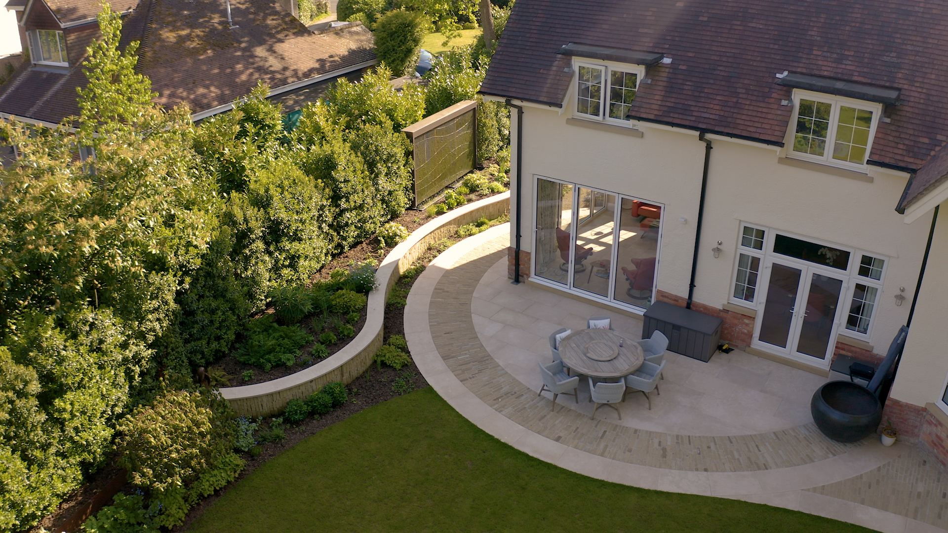 This project serves as a perfect case study. The enduring appeal of limestone for patios and terraces lies in its natural beauty, durability, and timeless colour palette. Paul and Craig discuss how designer Tom Hill expertly used a warm colour scheme that complements the property’s brickwork and render.