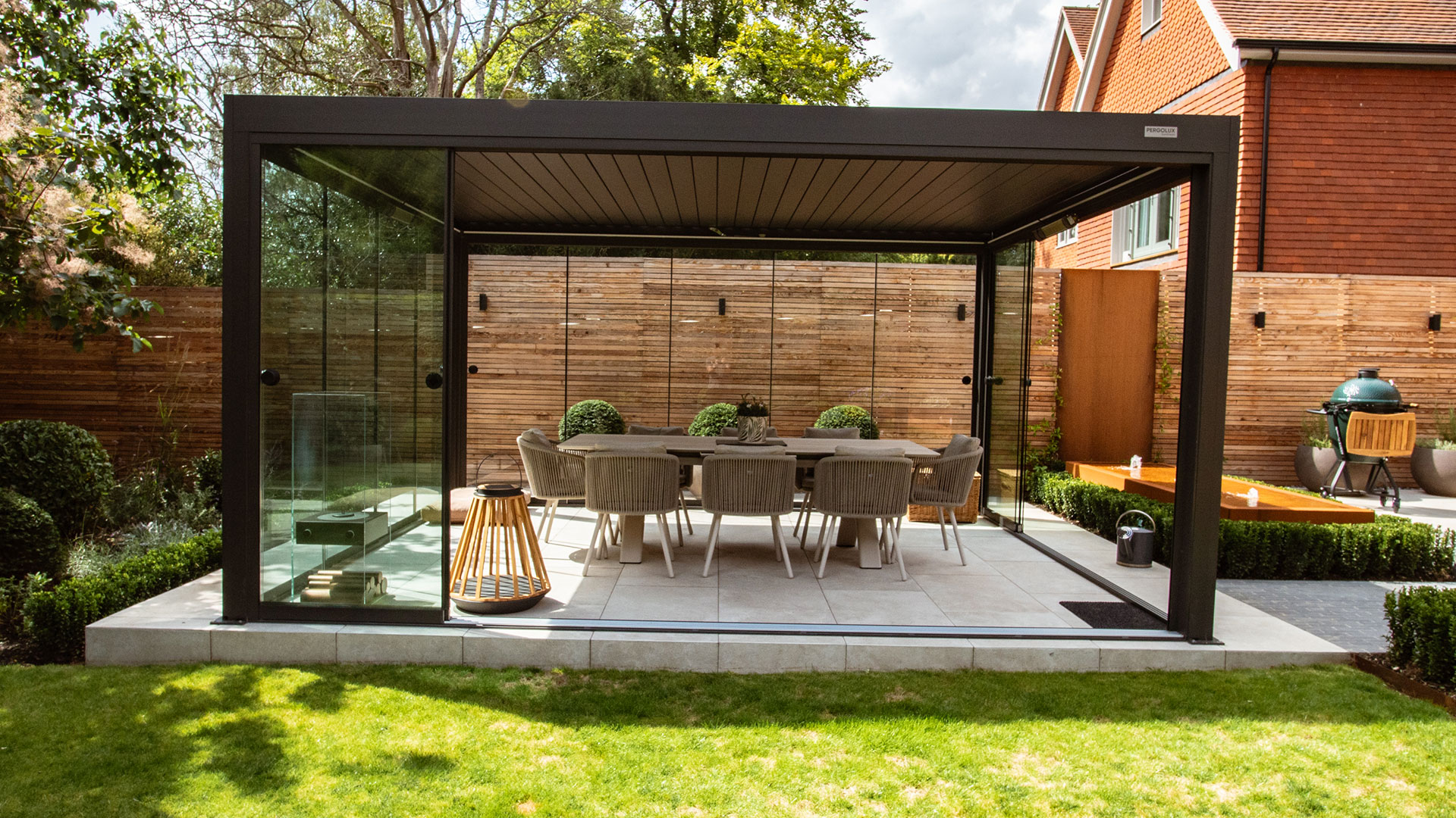 The Dining Space: A separate, seating area with comfortable, grey-toned furniture under a pergola that invites lazy afternoons and alfresco dining.